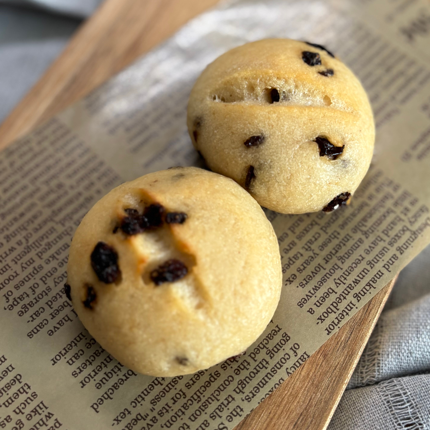 弾力のあるふわふわ生地にレーズンを入れました。ほのかに香るリンゴは甘さ控えめで食事の邪魔になりません。