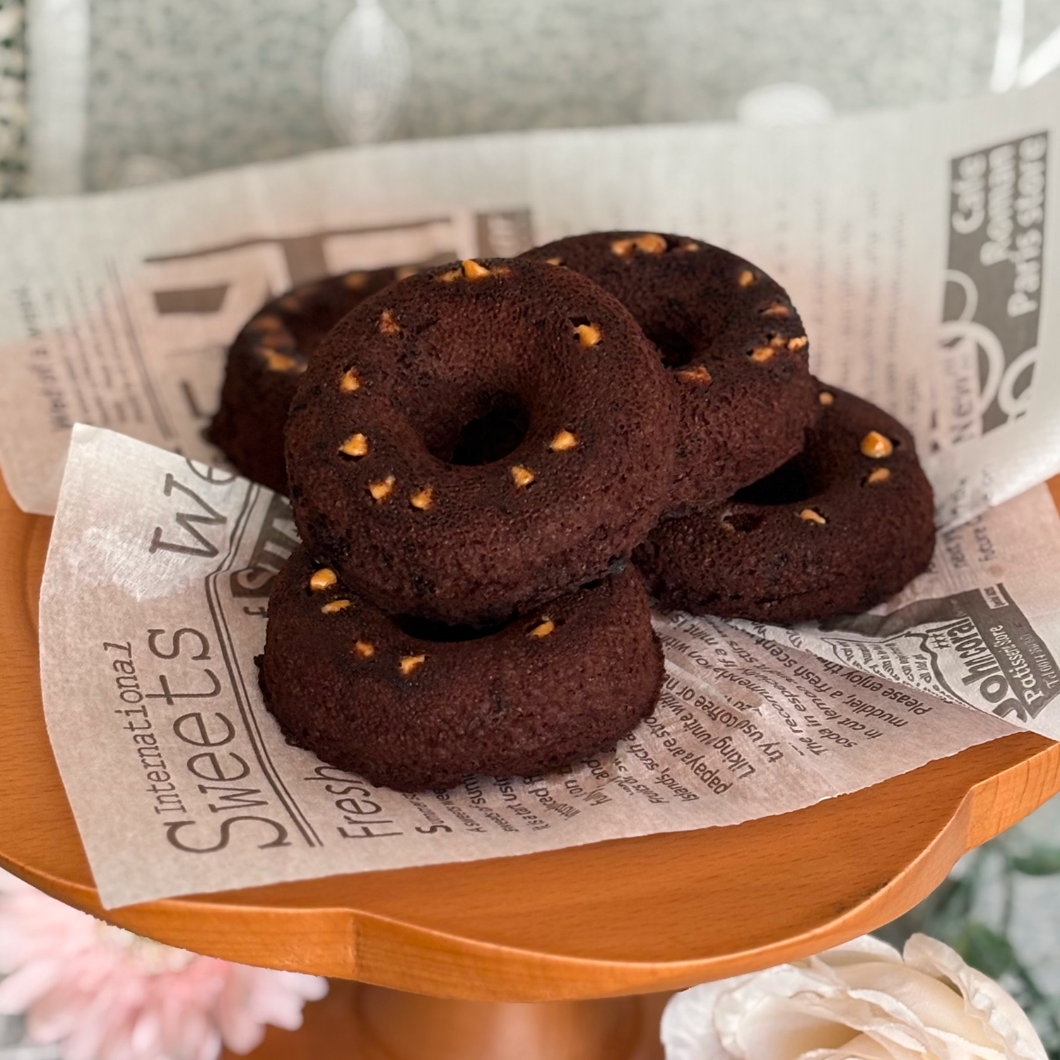 おからパウダーを使った揚げないドーナツ。食物繊維とタンパク質が豊富です。ショコラ生地とキャラメルチョコチップで懐かしい味わいのふわふわなドーナツです。