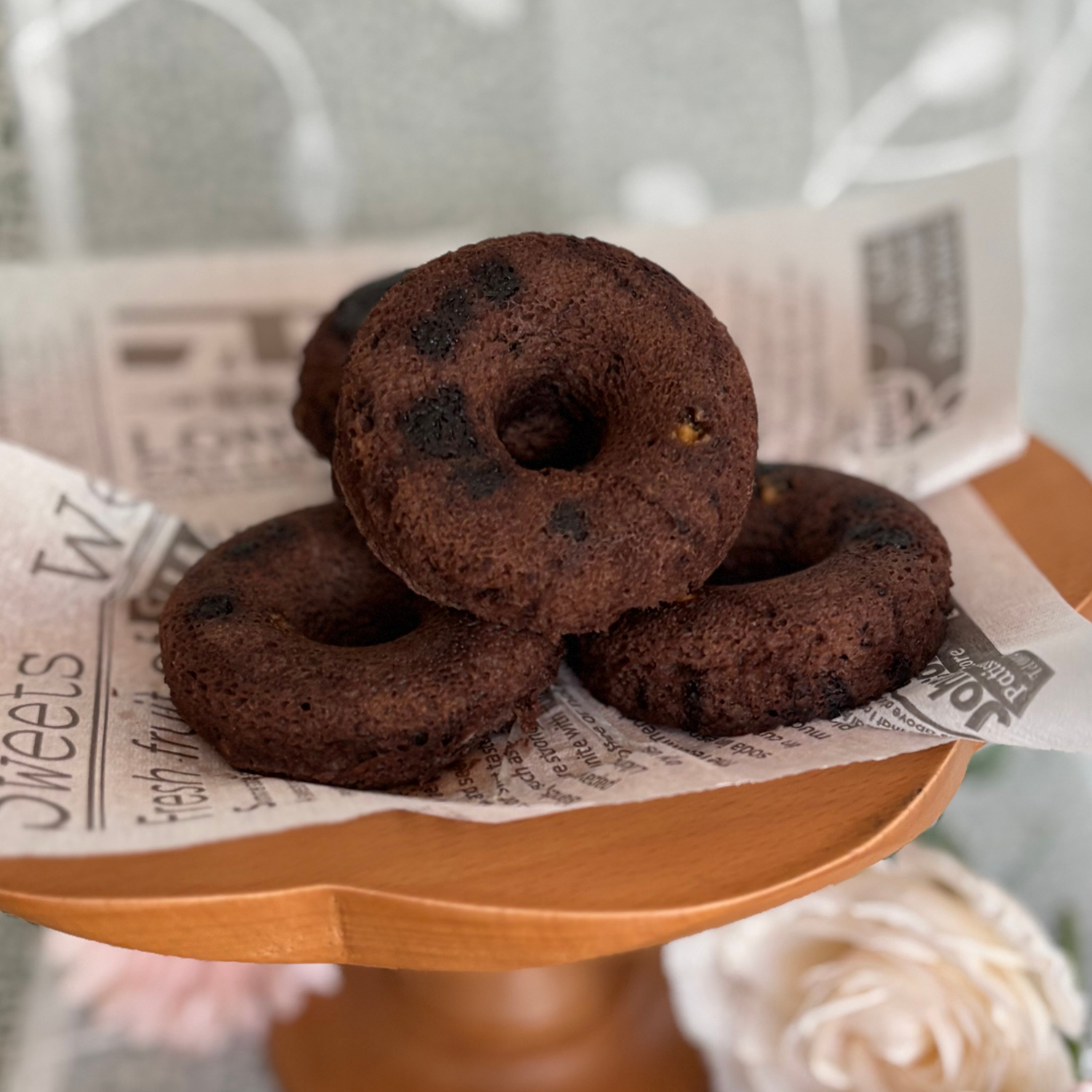 おからパウダーを使った揚げないドーナツ。食物繊維とタンパク質が豊富です。ショコラ生地にチョコチップを合わせ、チョコ好きさんにはたまらないダブルチョコ仕様。